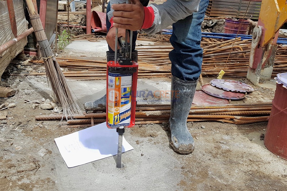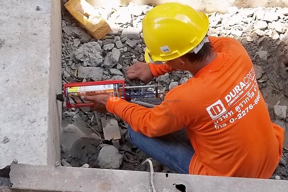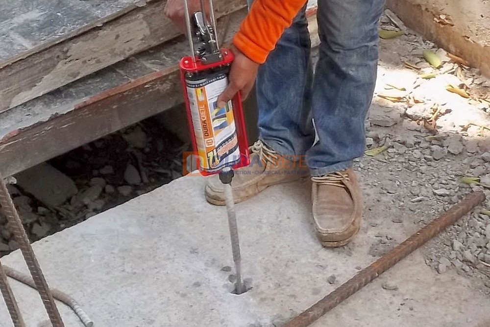 เตรียมเจาะรูตามขนาดเส้นผ่าศูนย์กลางความและความลึกที่กำหนด (ขึ้นอยู่กับขนาดเหล็ก) ทำความสะอาดรูที่เจาะด้วยแปรงลวดและปั๊มลม จากนั้นยิงน้ำยา เริ่มจากก้นรูปริมาณไม่น้อยกว่า 1/3 ของความลึกรู เสียบเหล็กเสริม |