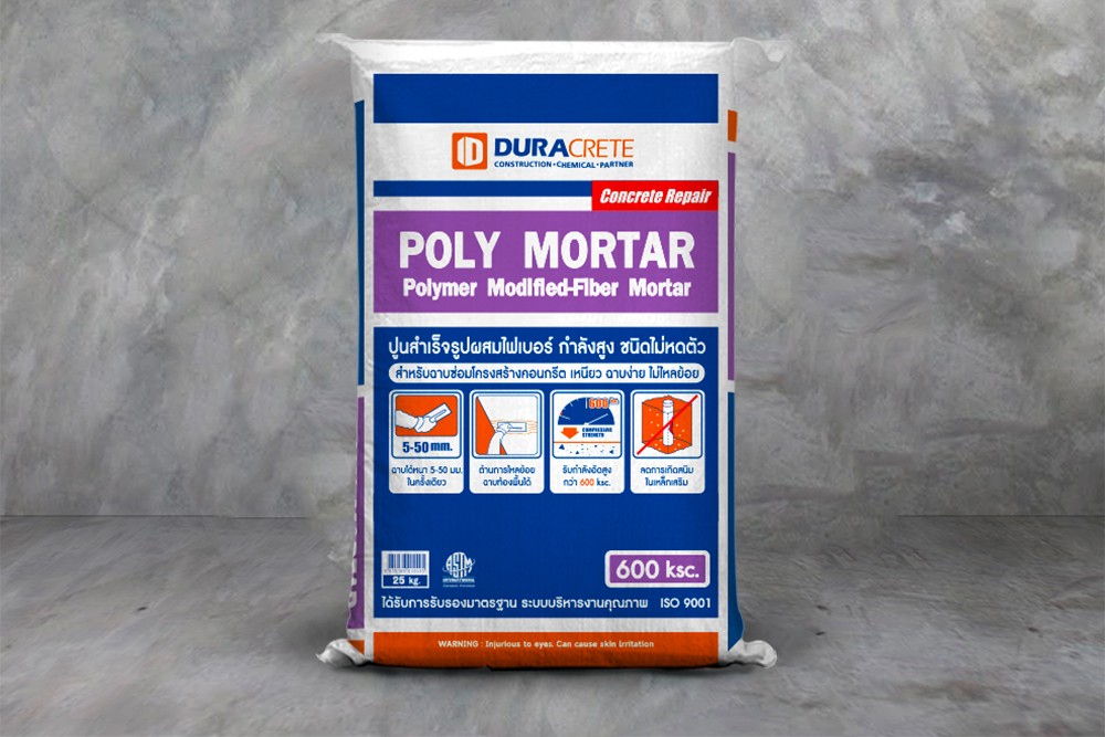 ปูนสำเร็จรูปผสมไฟเบอร์ สำหรับฉาบซ่อมงานทั่วไป ชนิดไม่หดตัว ผสมเส้นใยไฟเบอร์ (Poly Propylene Fiber) และ โพลิเมอร์ที่มีคุณสมบัติพิเศษ เพิ่มการยึดเกาะ ต้านการ ไหลย้อย ไม่หดตัวเมื่อแห้ง (Shrinkage Compensated) ทนทานต่อการขัดสี ทนทานต่อการกัดกร่อนของน้ำทะเล ให้การยึดเกาะได้ดีเยี่ยมกับคอนกรีตโครงสร้างค่าการดูดซึมน้ำต่ำ ลดการเกิดสนิมของเหล็กสูงฉาบง่าย ลดการแตกร้าวของผิว